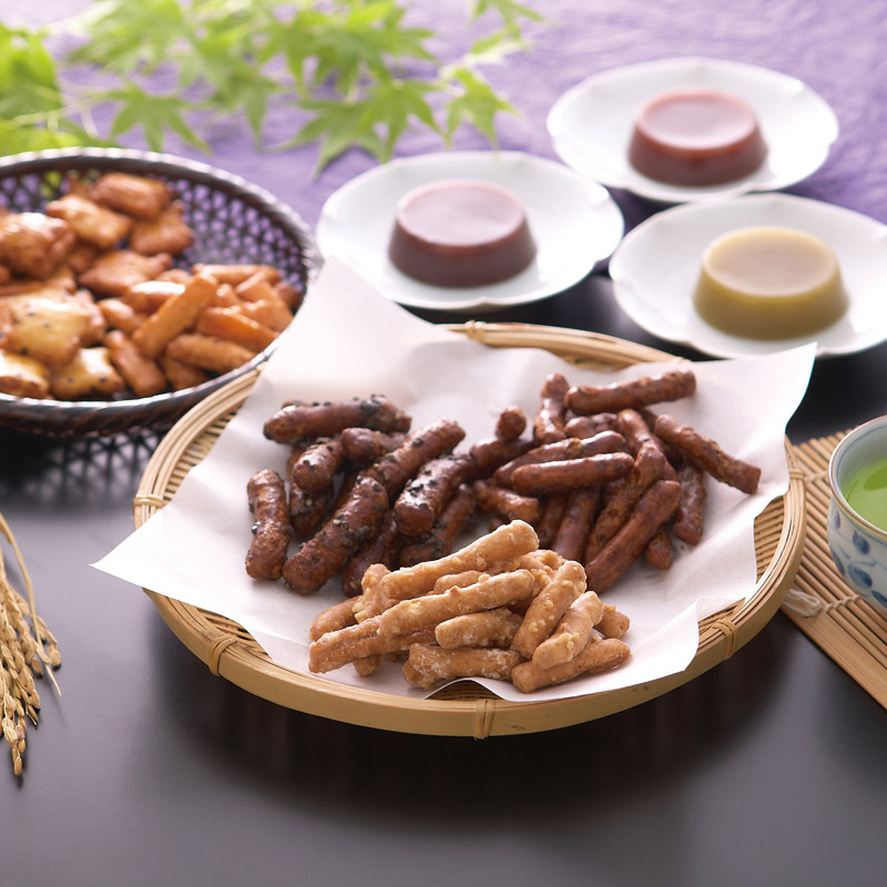 昔ながらの素朴な味のかりんとう、夏でも冬でも楽しめるまろやか羊かんと国産米だけで作った3種類のあられを詰合せました。