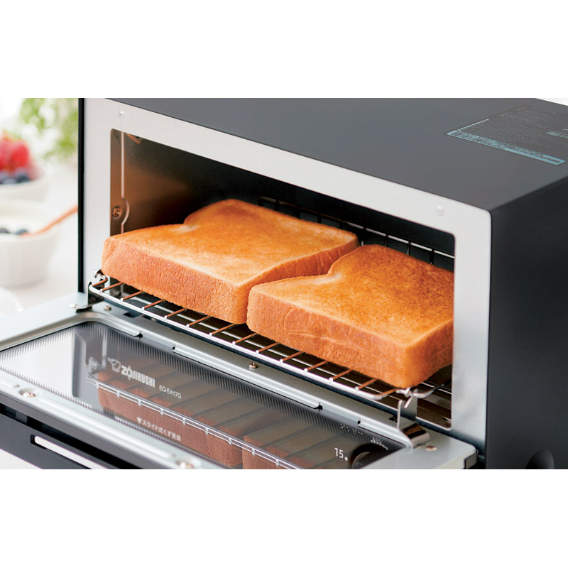 庫内奥行17㎝でトーストが2枚焼けます。・焼き網・丸洗いOKのスライド式くず受け皿。・15分タイマー。
