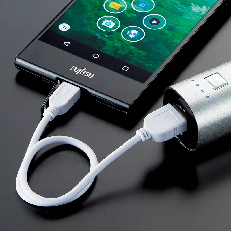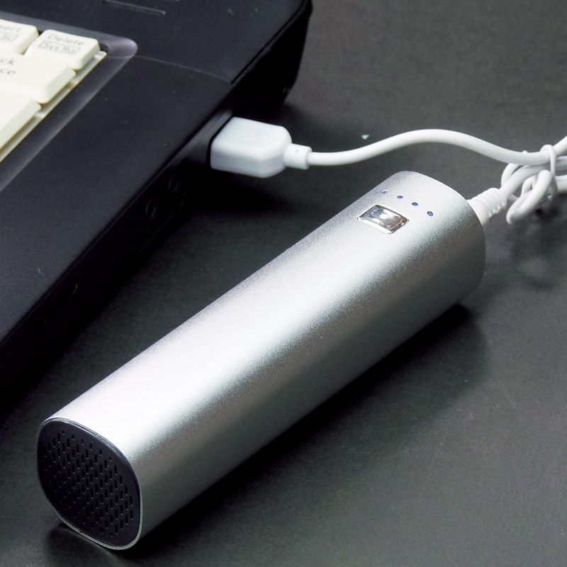 スマホ対応の大容量4000mAhの充電器、コード不要で音楽が楽しめるブルートゥーススピーカー、LEDライトの3ウェイに使えるマルチ充電器です。電池残量をランプで表示します。