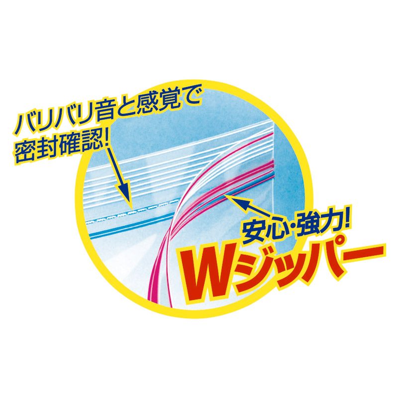 Wチャックで密封性バツグン。バリバリ音と感覚で密封確認が簡単に出来ます。内容物や保存日が書けるメモスペース付き。