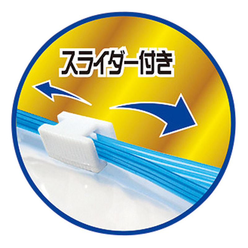 チャックの開け閉めが簡単なスライダー付き。80㎜のマチ付きなので立てて保存が出来ます。メモが書けるメモスペース付。