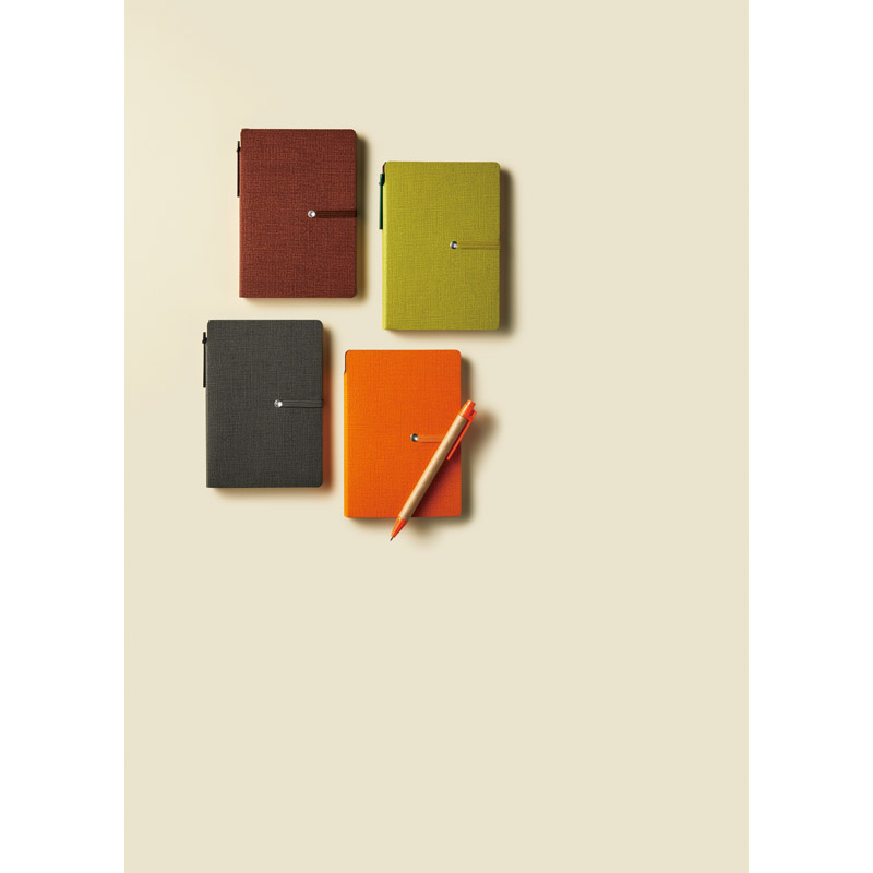 ログイン付箋と筆記具を備えた実用性の高い上質なノートブック。