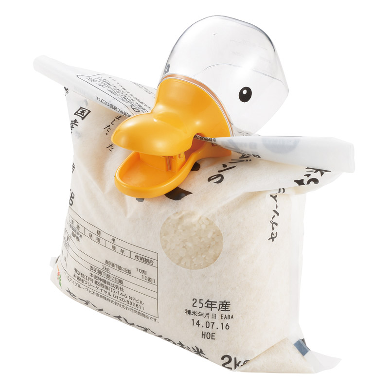 お米の計量と袋を閉じるをサッと手軽に。かわいいポップなデザイン。袋をかわいく閉じられます。約一合分をすくえます。