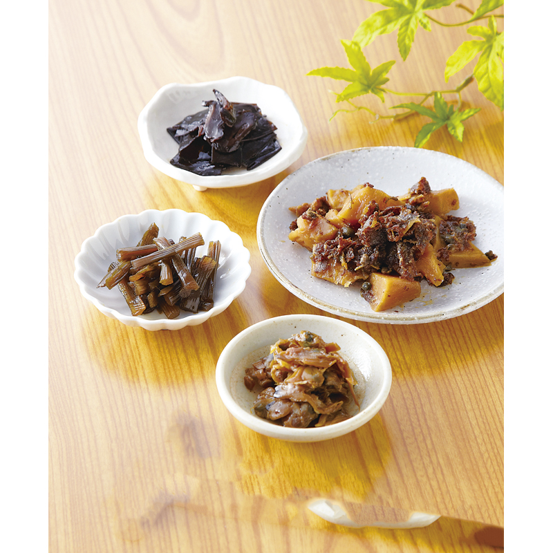 牛肉ごぼう50g・椎茸昆布60g・ごま昆布30g・畑の肉みそ煮30g・しそ昆布30g・浅利しぐれ煮50g・きゃら蕗60g×各1