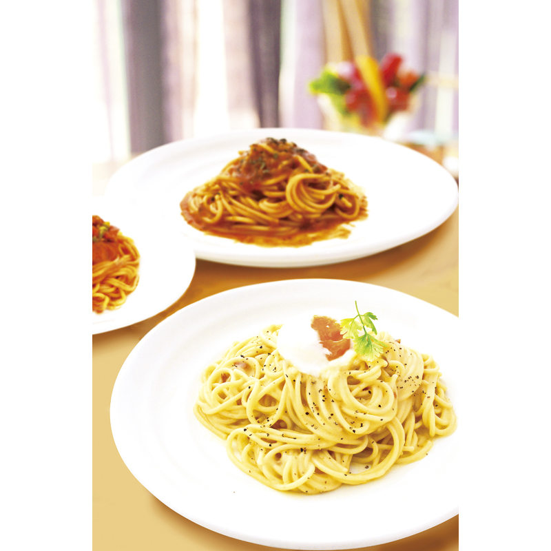 スパゲティと2人前容量250gのパスタソースがセットになりました。クリーミーさと黒コショウを効かせた「カルボナーラ」は、ベーコンの風味豊かに濃厚に仕上げました。トマトと野菜の旨味が詰まった「ナポリタン」ソースもお楽しみいただけます。