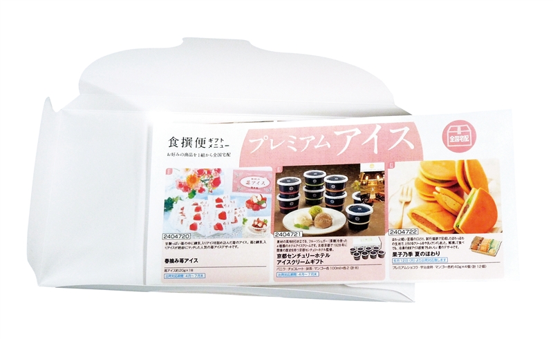 受け取った方の満足感を満たす高品位なデザイン。食撰便の申込用紙以外にも、「名刺」「サービスクーポン」「割引券」「案内チラシ」などを同封しても効果的です。四辺を折りたたんで包むたとう式の形状です。