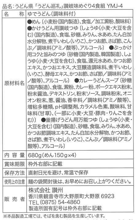 | 備考 | <セット内容> 生タイプゆでうどん150g×4 かけつゆ25ml×1 カレーうどんスープ15g×1 釜揚げ用万能つゆ20ml×1 ぶっかけ用コクと旨みのつゆ20ml×1 |