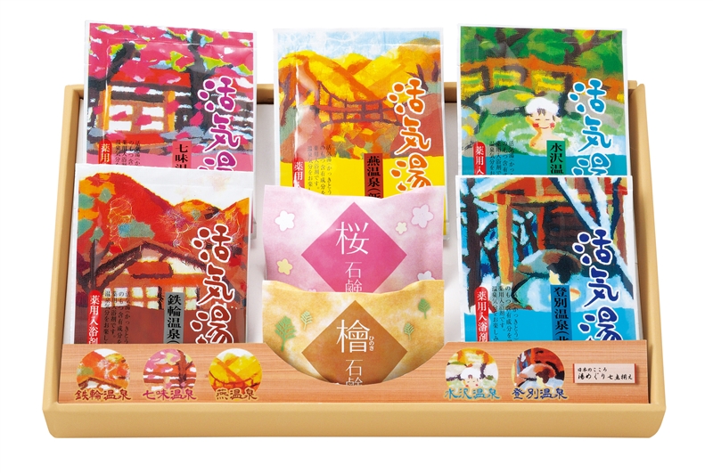 長野の七味温泉から北海道の登別温泉まで、5つの名湯の入浴剤と、檜と桜の石鹸の7点セット。ギフト向け入浴剤ノベルティで、包装や熨斗も可能。贈り物としては、温泉気分をお届けできる一品で、心も体も温まるギフトとして喜ばれています。全国の名湯をご自宅で楽しんで、温泉の癒しを贈りましょう。