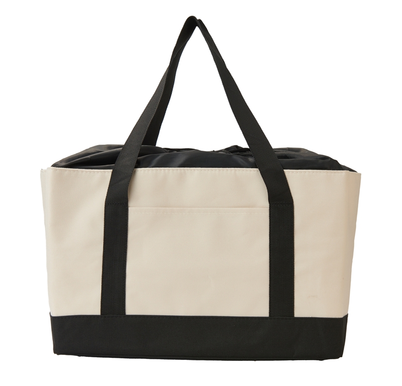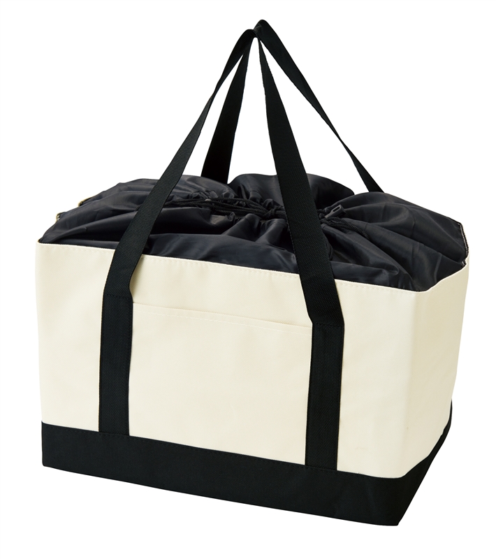 アルミ蒸着加工の大容量エコバッグ。シンプルなデザインで日常のお買い物やレジャーに最適。使い勝手が抜群で、レジカゴにもぴったり収まります。巾着仕様の口で中身を見せず、こぼれる心配もありません。