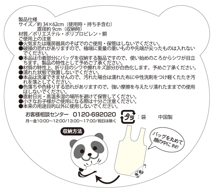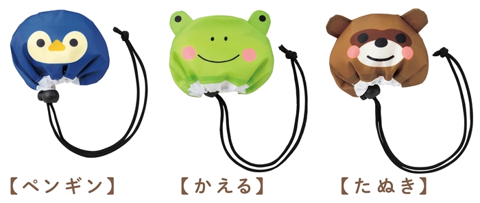バッグと収納部が一体化しているので、使用時に収納袋が邪魔になりません。肩掛け可能なB4くらいのサイズ感。愛くるしいペンギン・かえる・いぬ・パンダ・たぬきの5種類を取り混ぜてお届けします。ポケットにも入れて持ち運べるのでペットショップやスーパーのキャンペーン・購入特典のプレゼントにおすすめです。