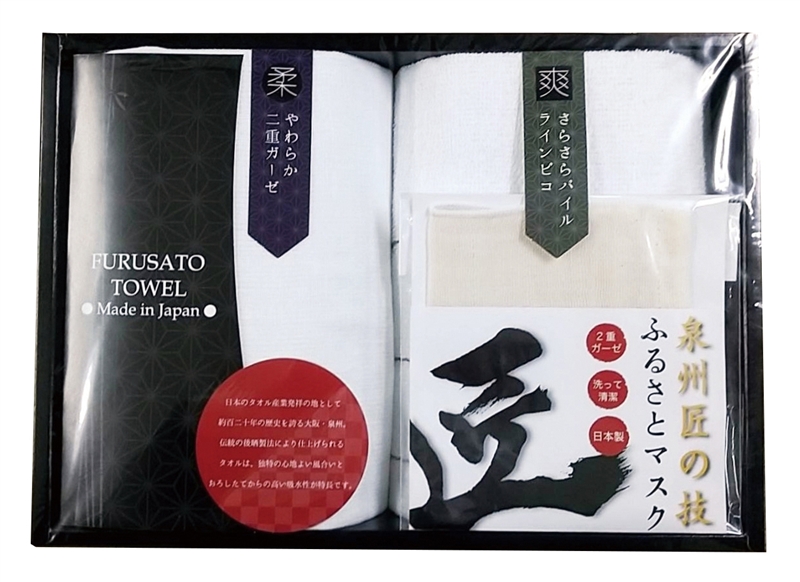 | 備考 | <セット内容> パイルウォッシュタオル×1 二重ガーゼウォッシュタオル×1 泉州匠の技ふるさとマスク×1 |