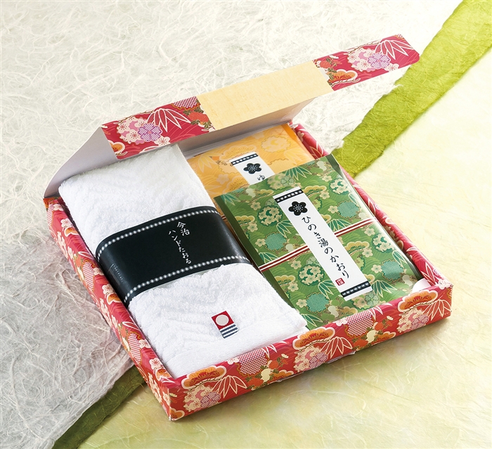 今治タオルブランドの認定を受けたジャガード織りのハンドタオルはサイズ約34×35cmの申し分ない大きさです。入浴料はひのき・ゆずの香りの2種類がセットされています。気持ちの良い香りに包まれながらじっくり入浴できます。美しいデザインの化粧箱入りで贈り物にも最適です。