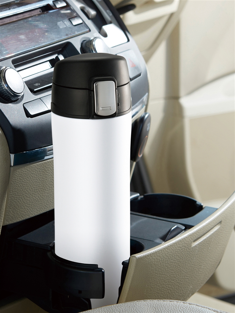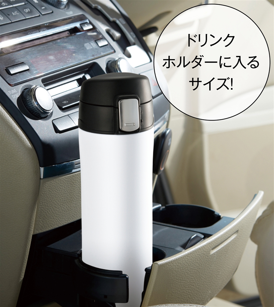 読書しながら、スマホを見ながらでも片手でポンッと楽々オープン♪入れたてキープの真空二重構造です。車のドリンクホルダーにも。