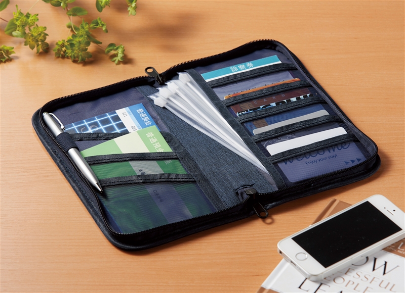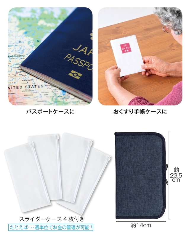 週単位での予算管理にぴったりな4枚のスライダーケース付き。9つのポケットが付いており、お薬手帳や診察券入れとしても便利。両サイドからぐるっと回るファスナーで開閉するので、中身が一目瞭然!名入れが可能で、オリジナルのノベルティにも最適です。商店街や金融機関などでの記念品としてもおすすめです。