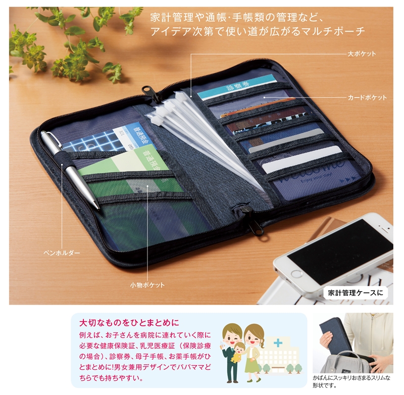 家計管理や通帳、保険証、マイナンバーカード保管等、アイデア次第で使い道が広がるデニム調生地のポーチ。