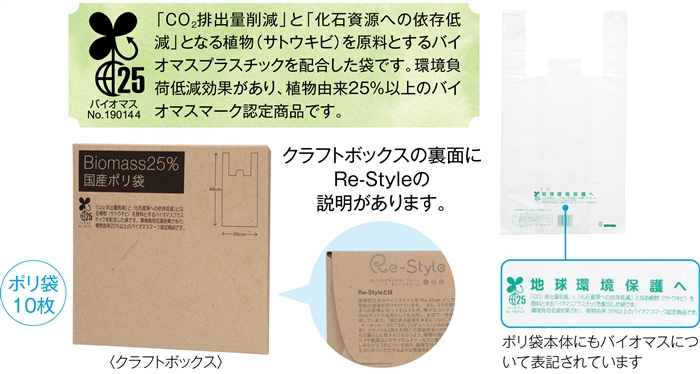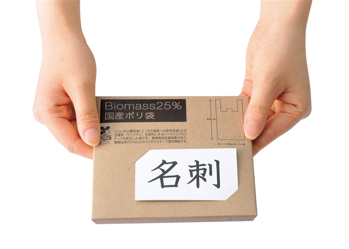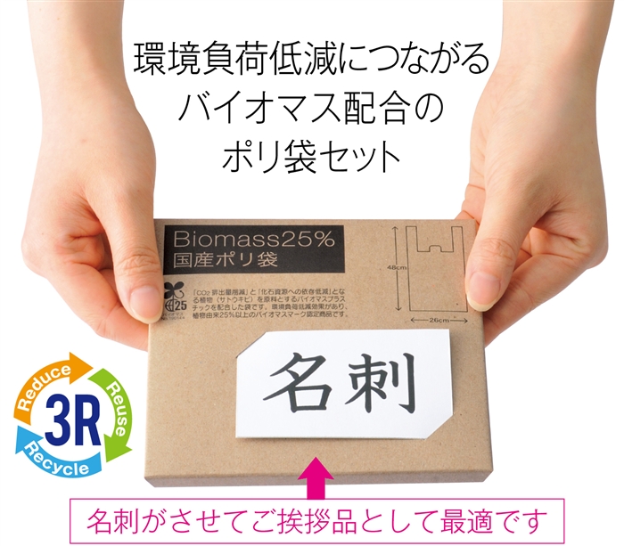 環境負荷低減につながるバイオマス配合のポリ袋セット。パッケージに名刺を差せるのでご挨拶品にも最適♪