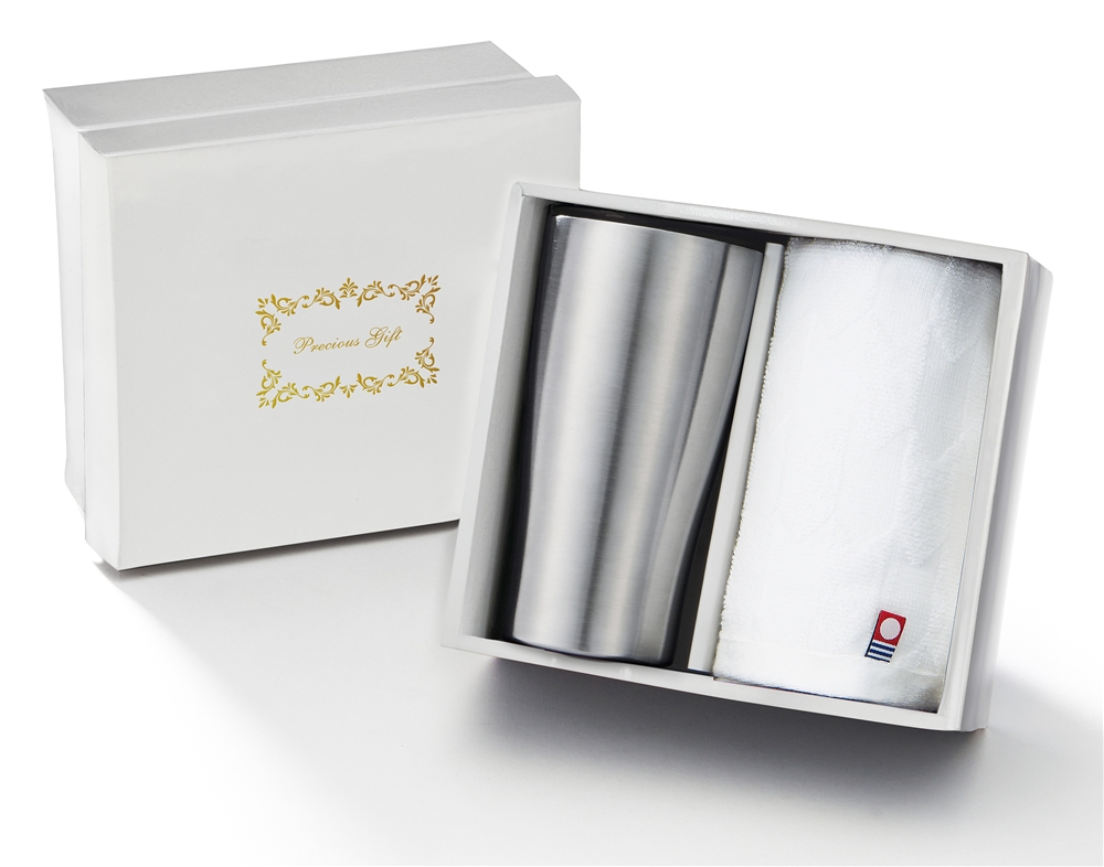 贈答品にふさわしい真空ステンレスタンブラーと今治フェイスタオルのギフトセット。ご成約記念のほか、創立・創業・周年記念、社内表彰向けにおすすめです。