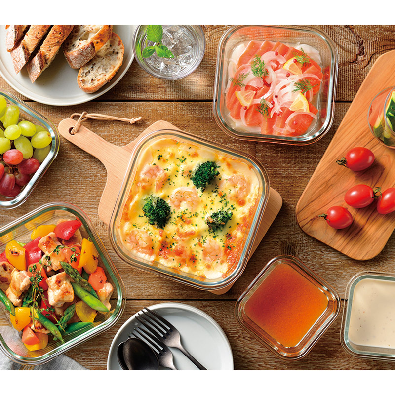 本体は耐熱温度差120度の耐熱ガラスなので電子レンジはもちろん、オーブン調理も可能。ニオイもつきにくいです。蓋はシリコーンパッキン&4点ロックでしっかり保存することができます。ガラスで透明なので冷蔵庫の中を見たときに一目で中身を確認できます。食洗機OK。
