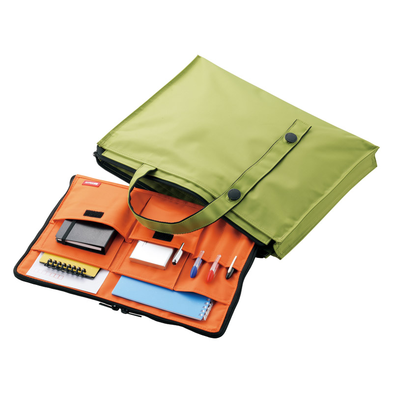 カバンの中をスッキリ、スマートに整理。大きく「コの字」に開くメインポケット×1、マチ無しポケット・マチ付きポケット×各2、ペンポケット×3