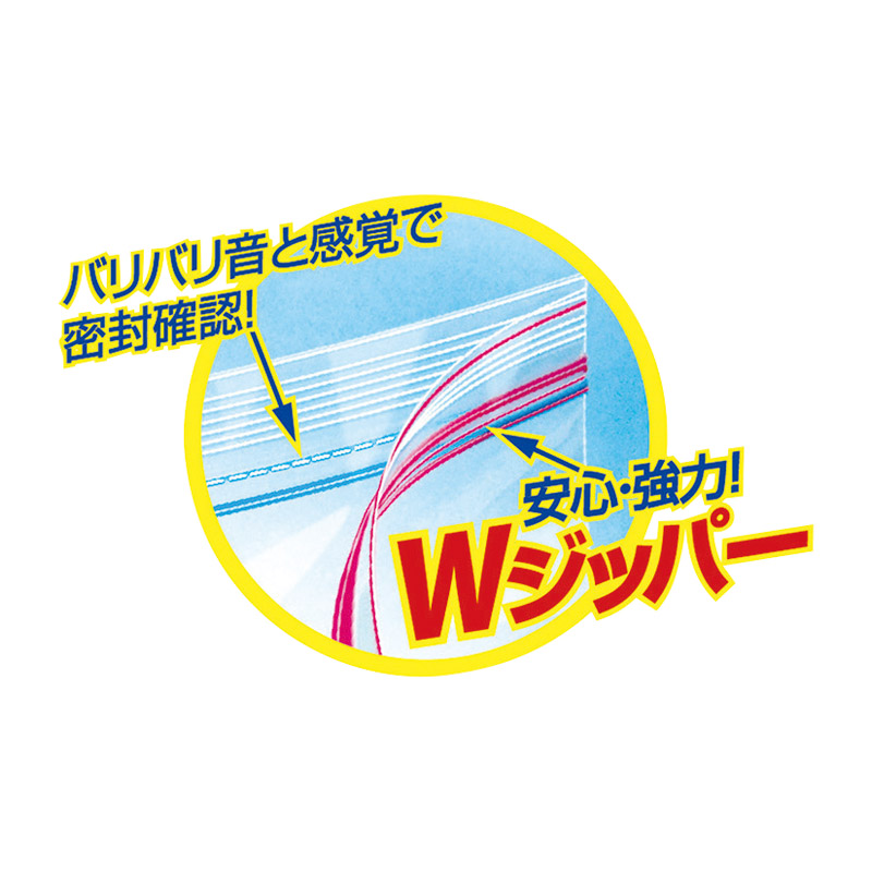 ログインマチ付きで立てて保存が出来るので冷蔵庫内がスッキリ。Wジッパーで強力密封。おいしさそのまま冷凍保存が出来ます。