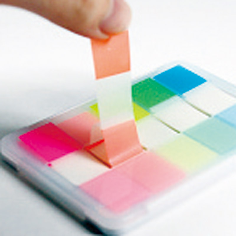 スリムなプラスチックケース入りのビックアップ式フィルム付箋。
