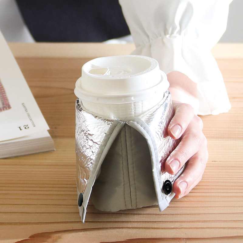 リサイクル素材使用の保冷温ボトルケース。ペットボトル以外にも缶やカップドリンクホルダーとしても使用可。コンパクトにまとめられるゴムバンドと携帯に便利なフック付。