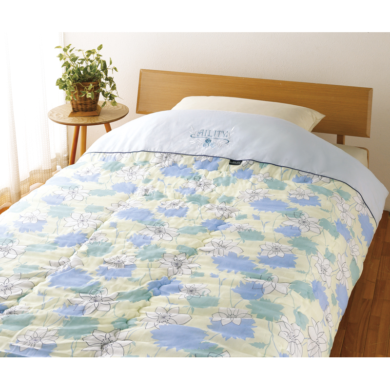 詰め物に東レ・セベリスの抗菌防臭素材を使用しました。ガーゼ素材の為、軽くてサラサラと肌触りが良く、春から秋までこれ一枚で快適に過ごすことができます。冬は羽毛布団の内側に使うと暖かさを逃がしにくいです。シーズンを通してお使いいただけます。