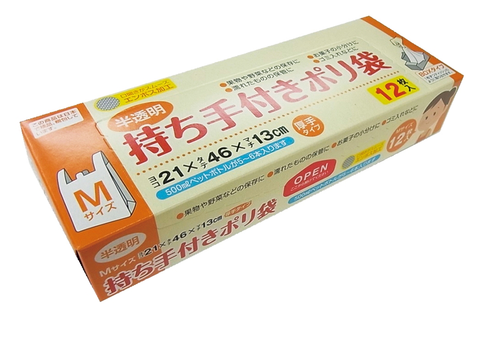 結んで持ち運べる取っ手付きポリ袋。エンボス加工で口開き抜群。箱入れなので1枚づつ取り出せるので便利。