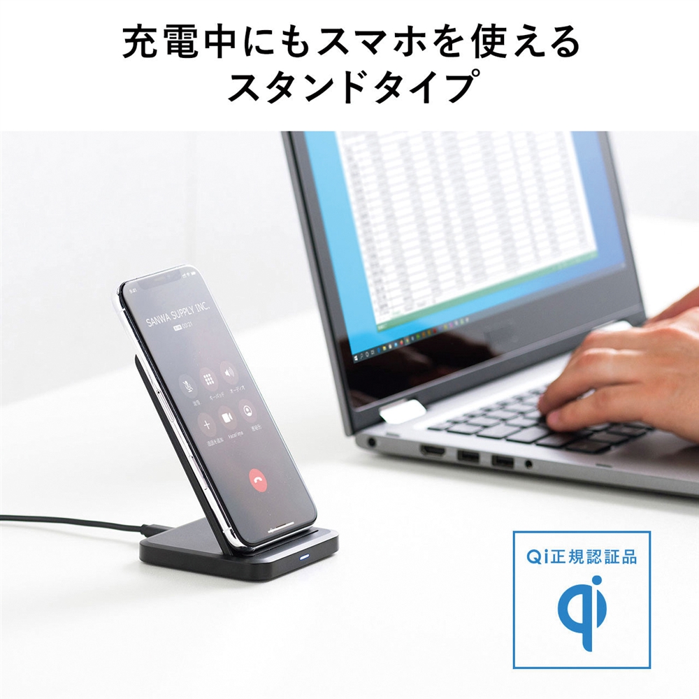 Qi規格に準拠したスマートフォンを置くだけで充電ができる、ワイヤレス充電スタンド