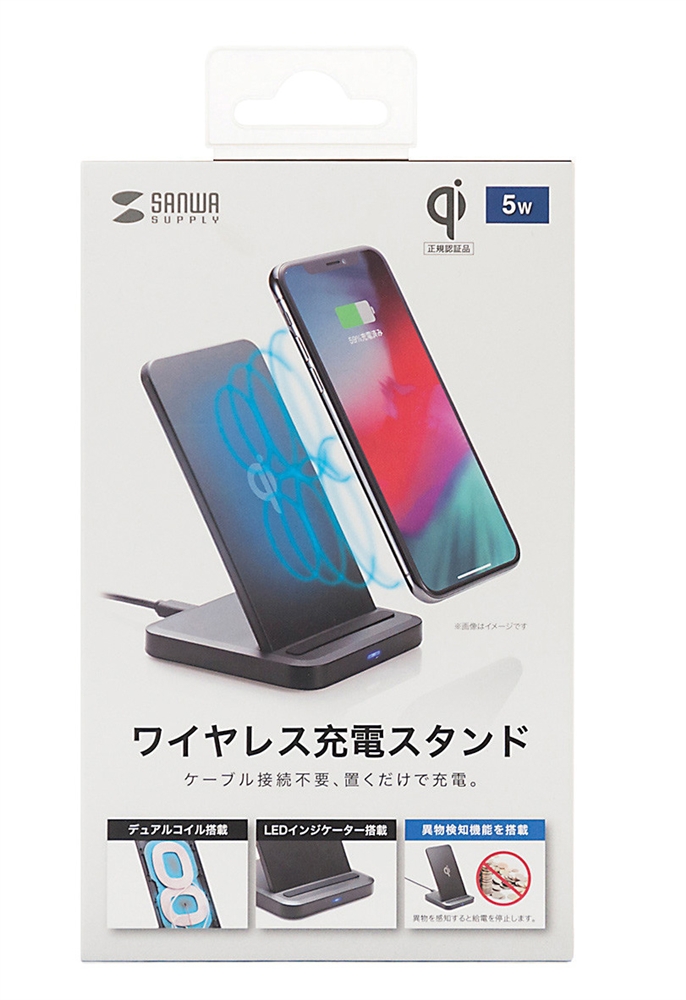 ●ワイヤレス充電の規格「Qi(チー)」に準拠したワイヤレス充電スタンドです。 ●デュアルコイル搭載でタテ置きでもヨコ置きでも使うことができます。 ●金属などの異物を検知すると充電を停止する異物検知機能を搭載しており、安全にご使用いただけます。