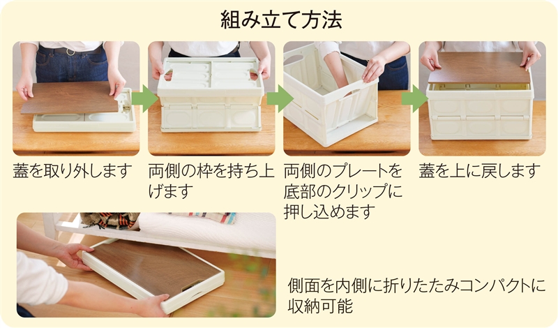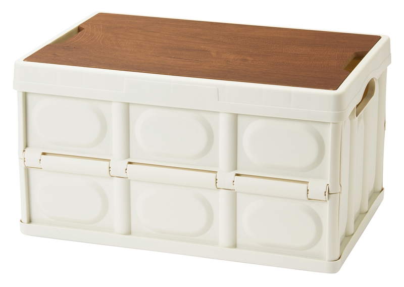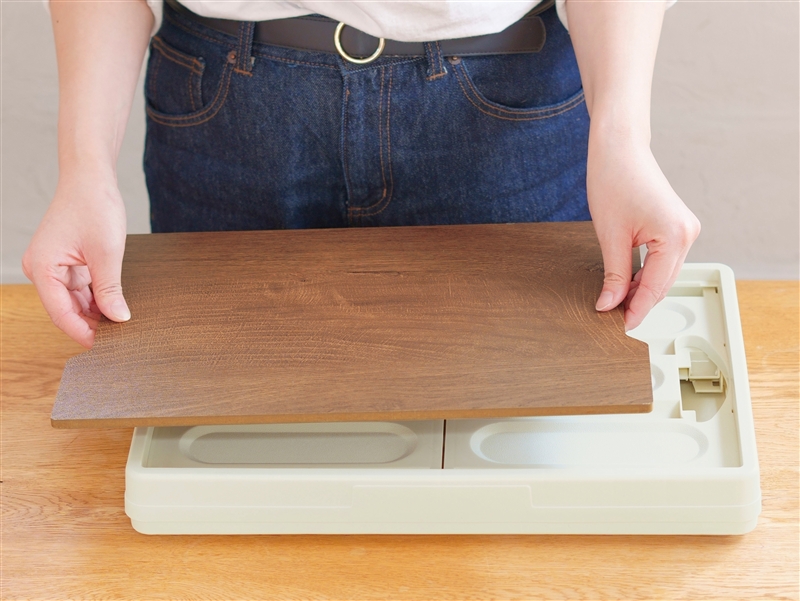 木目調のしっかりしたMDF製の蓋をテーブルとしても使えるスタイリッシュなコンテナです