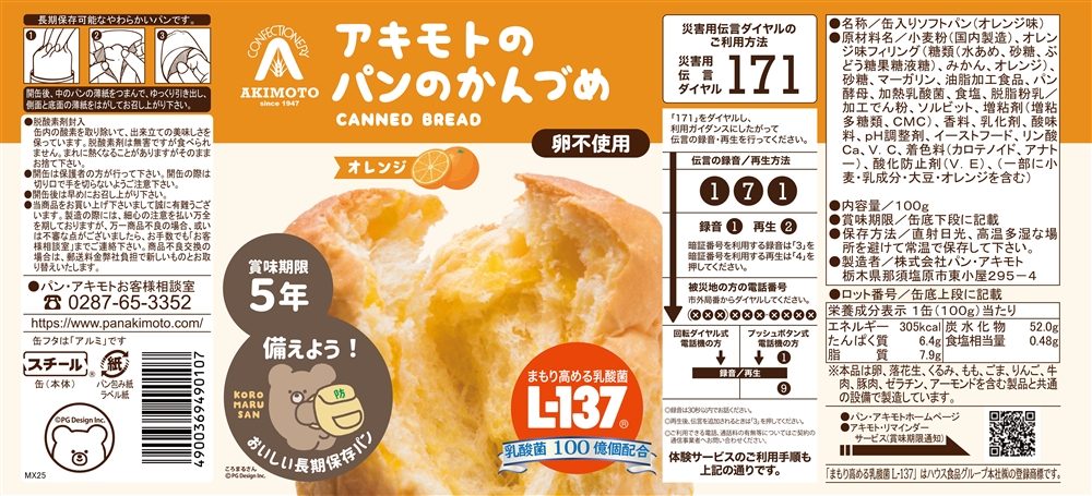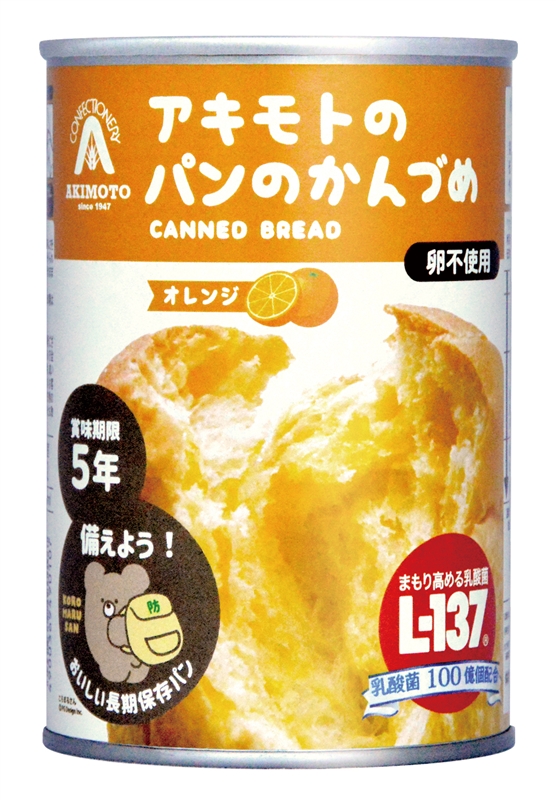 「まもり高める乳酸菌 L-137」を配合し、健康感にも気遣ったパンのかんづめです。テレビでもよく取り上げられている、「アキモトのパンのかんづめ」です。防災備蓄品として5年間の長期保存が可能です。ふわふわで美味しいパンです。