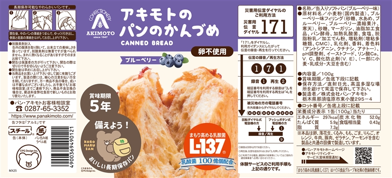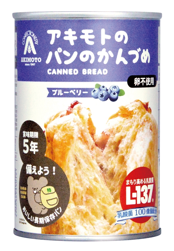 「まもり高める乳酸菌 L-137」を配合し、健康感にも気遣ったパンのかんづめです。テレビでもよく取り上げられている、「アキモトのパンのかんづめ」です。防災備蓄品として・5年間の長期保存が可能です。ふわふわで美味しいパンです。