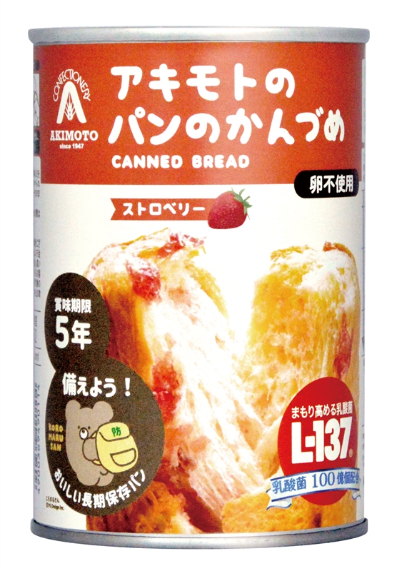 「まもり高める乳酸菌 L-137」を配合し、健康感にも気遣ったパンのかんづめです。テレビでもよく取り上げられている、「アキモトのパンのかんづめ」です。防災備蓄品として5年間の長期保存が可能です。ふわふわで美味しいパンです。