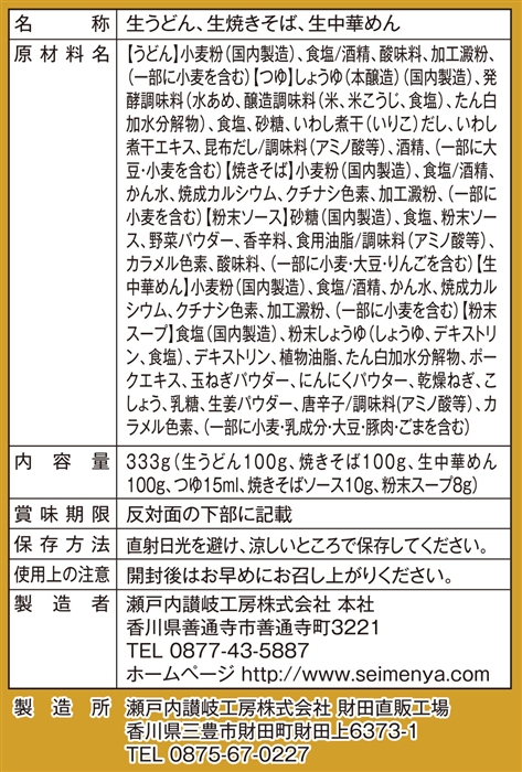 | 備考 | <セット内容> 麺100g×3 醤油粉末スープ8g×1 焼きそば粉末ソース10g×1 うどんつゆ15g×1 |