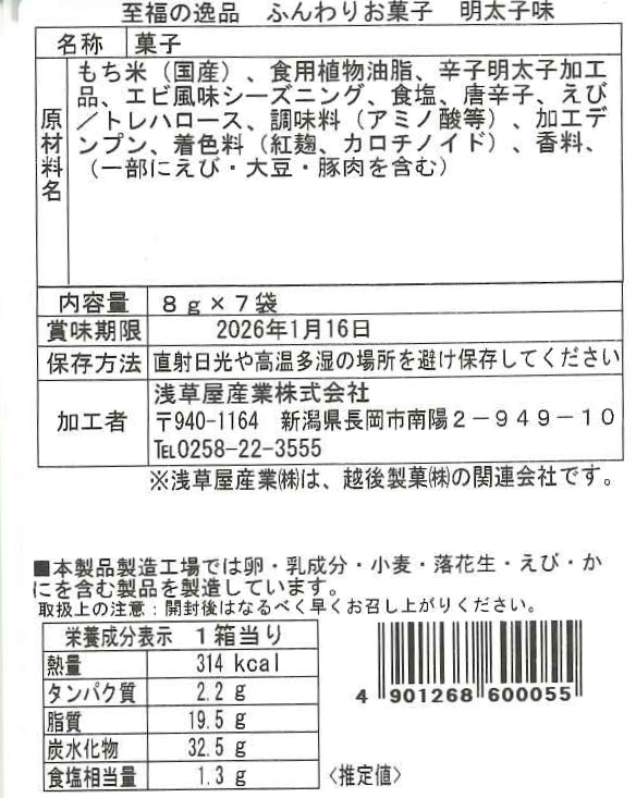 | 備考 | <セット内容> ふんわりお菓子めんたいこ味8g×7袋 |