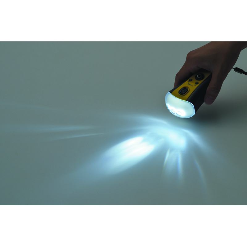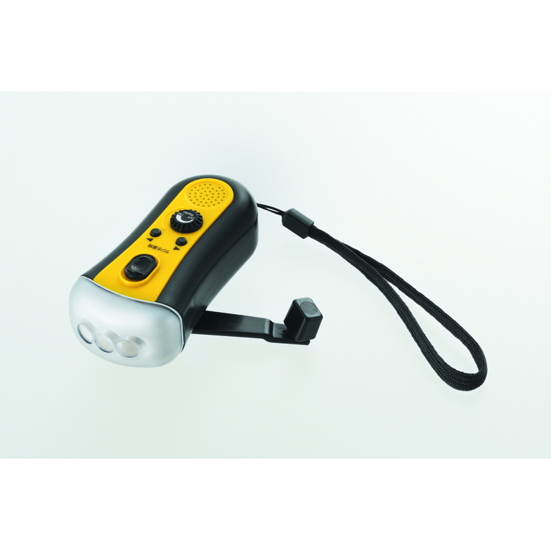 もしもの時のために備えておきたいミニサイズ。 充電方式:手回し、電源:充電池、機能:ライト・FMラジオ