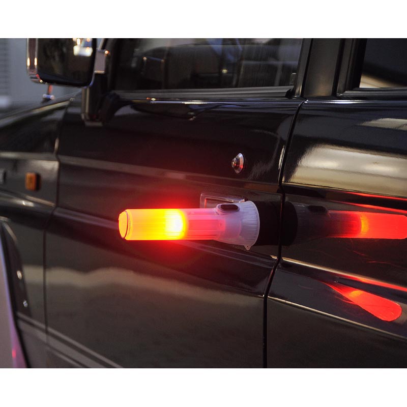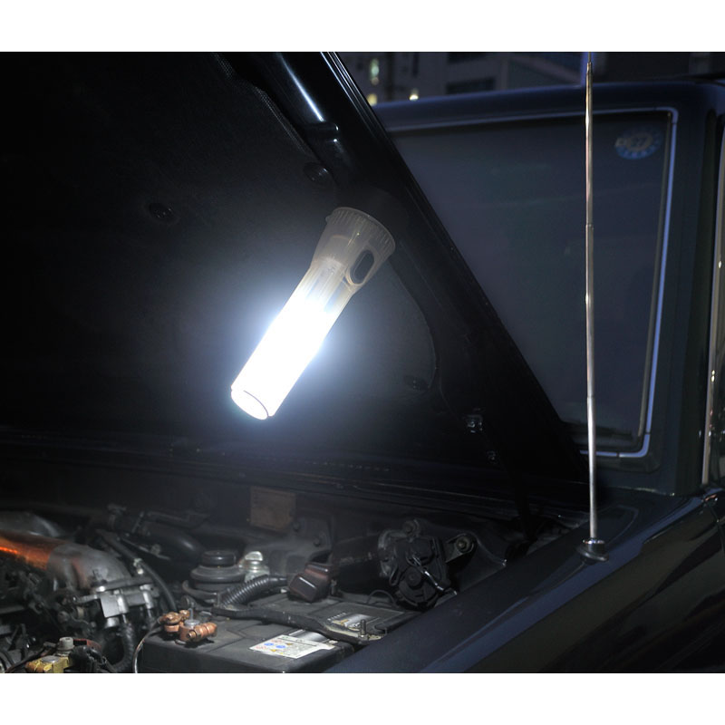 車体に取り付け非常信号用具にもなる、軽くて持ちやすい多目的LEDライトです。 レジャーに!防災に!車の非常時に!家庭に一台あれば重宝します。手元のスイッチで、ライトの「強」、「弱」、ランタンの「強」、「弱」、「赤点滅」に切り替えられます。ライト頭部には、ネオジウム磁石(4個)が付いており、ランタンとして使用可能!吊り下げ用フック付。単3・単4電池使用可。