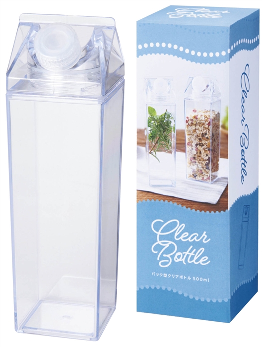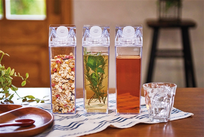 映える!牛乳パック型のクリアボトル。通常の飲み物はもちろん、ハーブやフルーツを入れたデトックスウォーター作りにも。