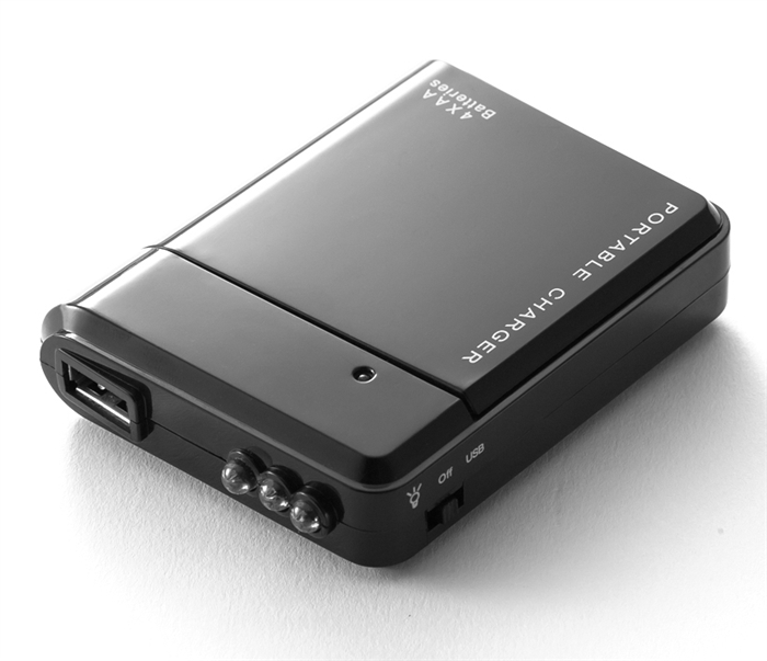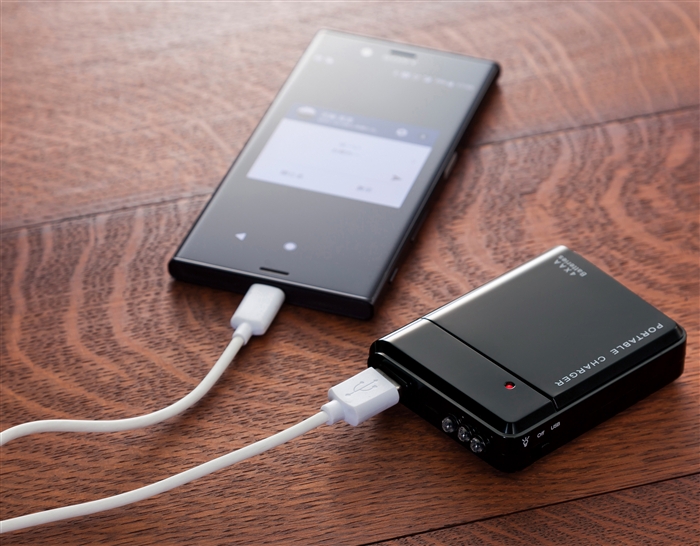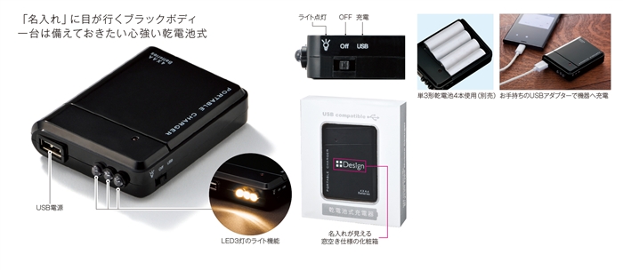 名入れが際立つブラックボディのモバイルバッテリー。停電時も心強い乾電池式。