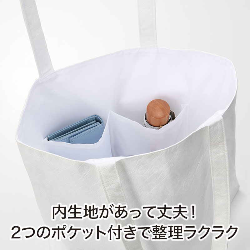 内生地も、ポケットも付いた贅沢仕様。丈夫なタイベック生地使用で、長くお使いいただけるので会社ロゴなどを印刷すれば、さらにプレミアム感ある逸品に