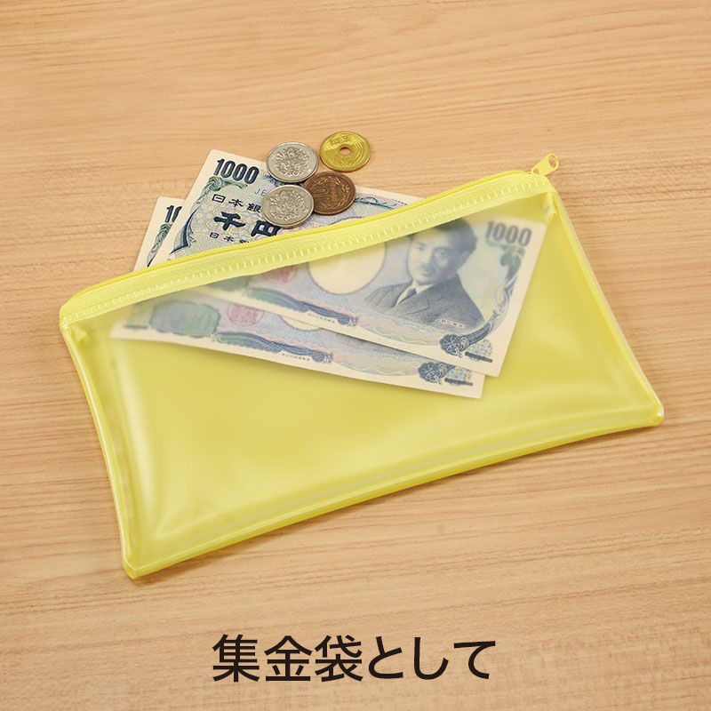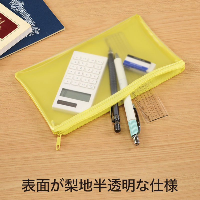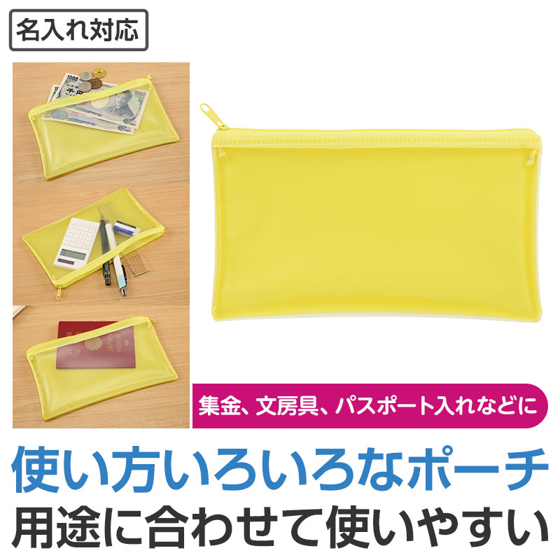 使い方いろいろで、いくつもらっても困らないポーチ。企業カラーに合う色を4色からお選びください。前面はマットな質感の半透明です