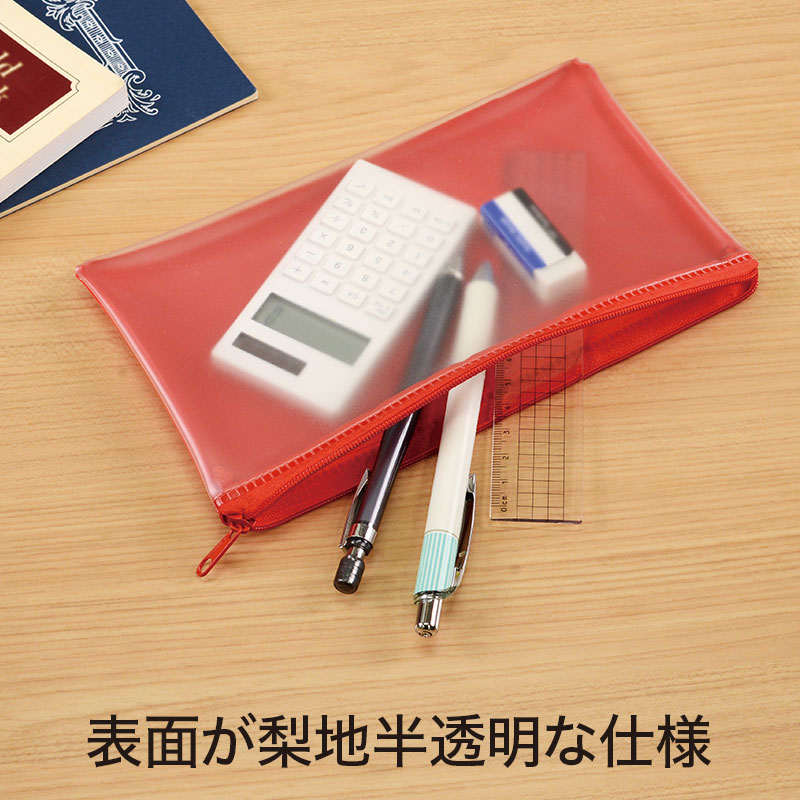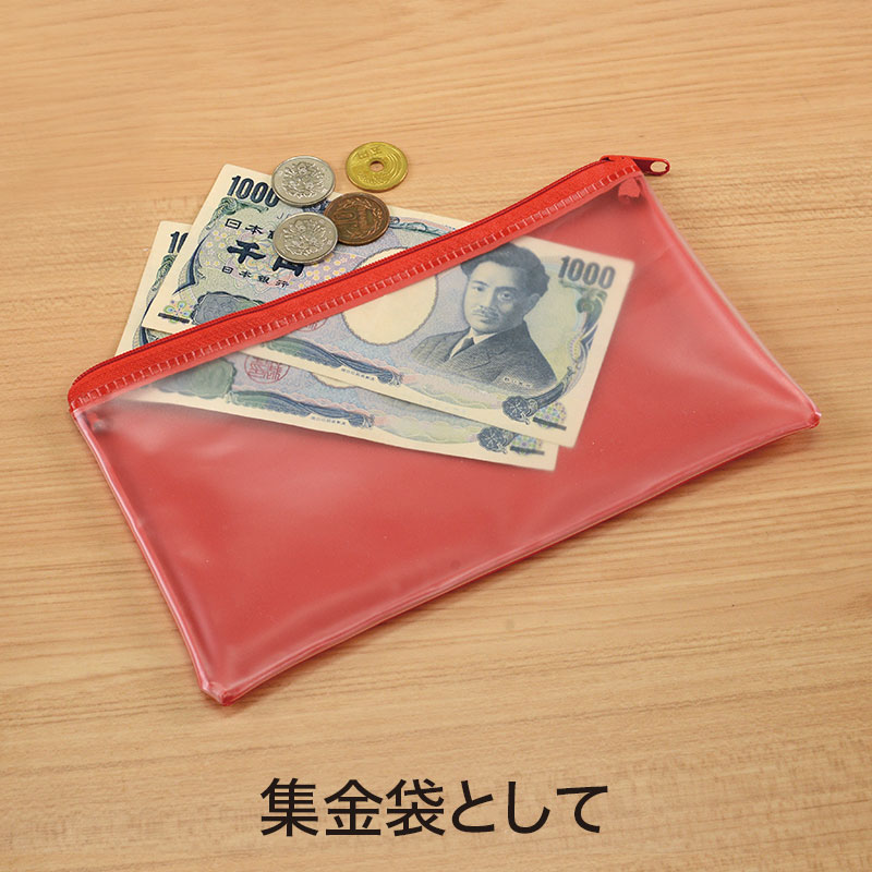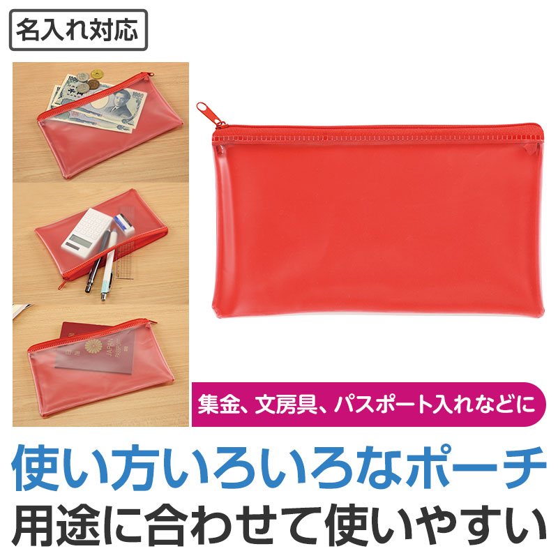 使い方いろいろで、いくつもらっても困らないポーチ。企業カラーに合う色を4色からお選びください。前面はマットな質感の半透明です
