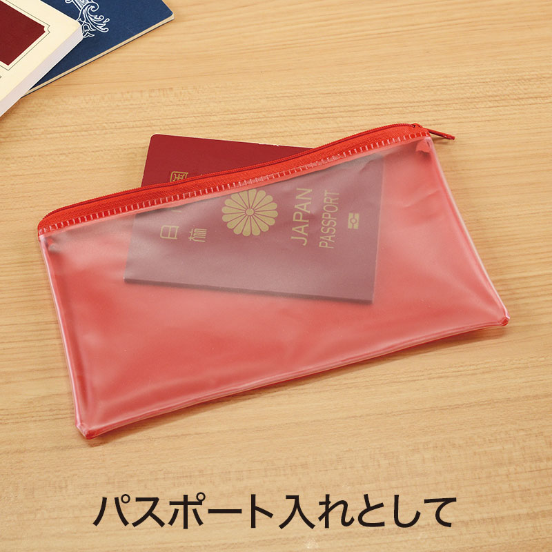 ログイン使い方いろいろで、いくつもらっても困らないポーチ。企業カラーに合う色を4色からお選びください。前面はマットな質感の半透明です