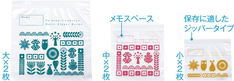 3サイズのジッパー付きパックセットで、保存と整理が便利。