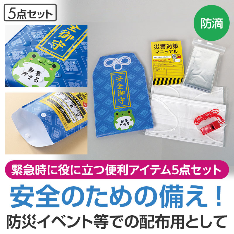 カバンに入れておけば、もしもの時に役立つ5点セット。「無事帰れますように★」の願いも込めて