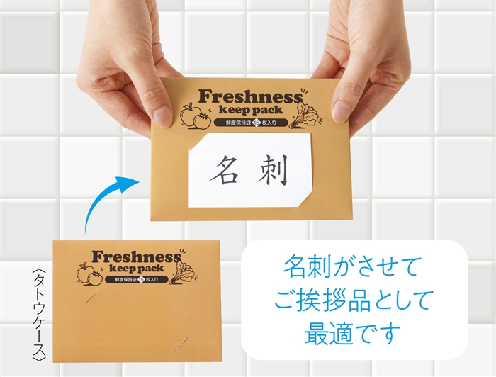 半透明で中が見やすく、無臭かつ柔らかい袋で、出し入れがしやすいパッケージには名刺やチラシを挿すことができ、ご挨拶品やノベルティに最適!環境に配慮した原材料でCO2排出を抑え、フードロスを防ぎます。