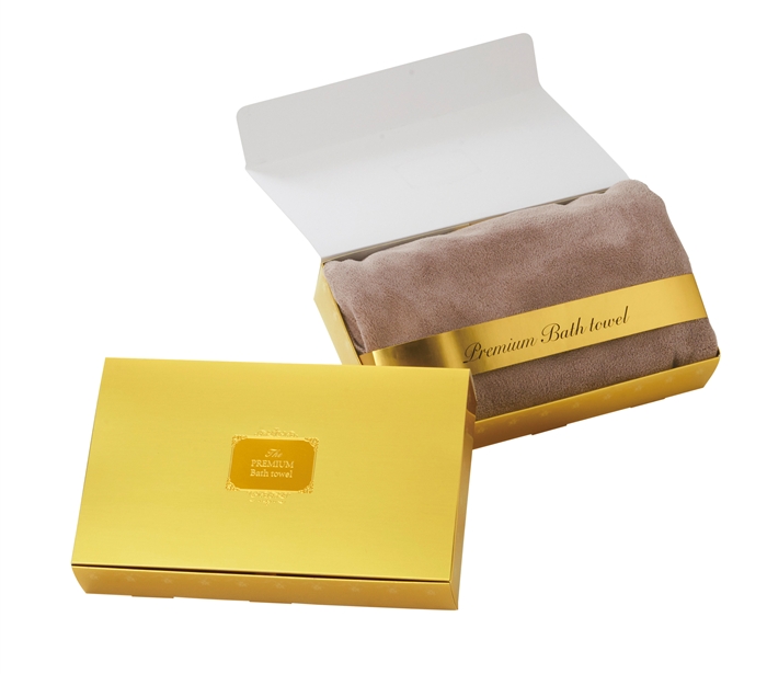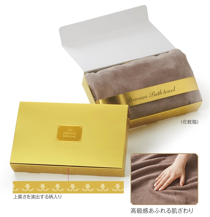 プレミアムバスタオルは、風合いから化粧箱に至るまで、上質を追求した逸品です。ゴールドの化粧箱にデザインを施し、特別感を演出。極上の肌触りを誇り、贈り物や記念品として最適。住宅展示場や金融関係の成約プレゼントとして人気で、肌寒い季節のノベルティや景品としてもおすすめです。