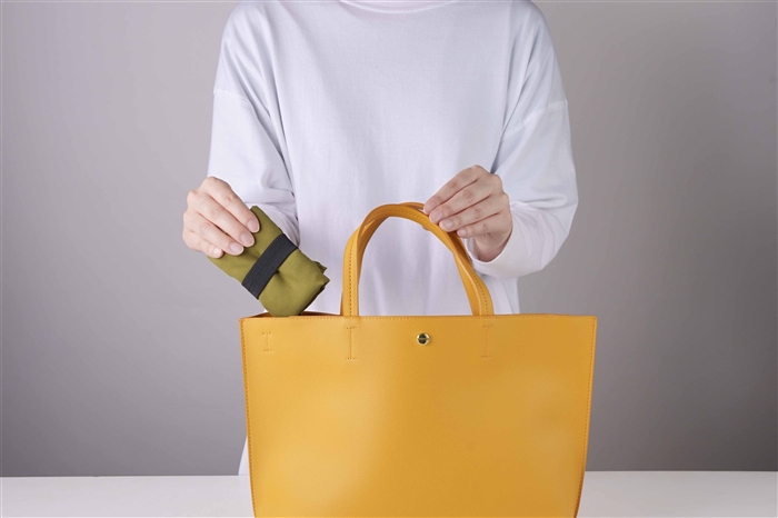 資料配布や教育機関向けに最適なA4トートです。付属バンドでくるっとコンパクトにまとめられて小さく携帯できます。シックなスエード風生地を採用。名入れすればノベルティや販促品に最適。使用するたびに知名度がアップします。