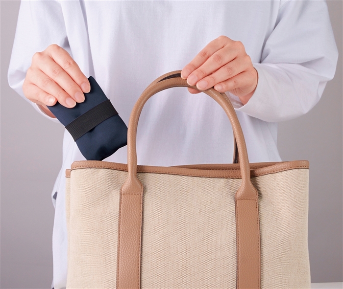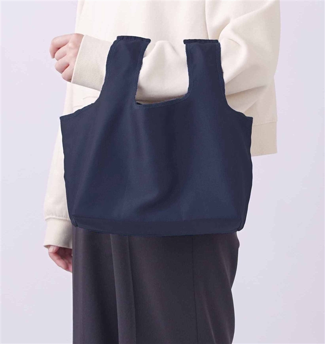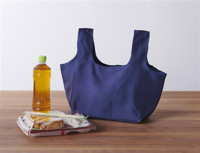 横も底もマチをたっぷり備え、コンビニ弁当がフラットに収まります。バンドで手の平サイズに折りたたみが可能です。高見えするスエード風生地を採用。ショップ名やロゴを入れてオリジナルエコバッグを製作できます。ランチや小買い物に便利で、知名度もアップします。